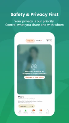பிரீமியம் உறுப்பினராகும் போது கூடுதல் சிறப்பு சலுகைகளை அனுபவிக்கலாம். பாதுகாப்பான உடனடி அரட்டை மற்றும் குரல் அழைப்பு அம்சங்கள் மூலம், எப்போது வேண்டுமானாலும், எங்கிருந்தும் உங்கள் பொருத்தங்களுடன் நேரடியாகத் தொடர்புகொள்ளலாம். கன்னட மேட்ரிமோனி "பிரைம்" பிரிவில் சரிபார்க்கப்பட்ட, நம்பகமான சுயவிவரங்களை மட்டுமே அணுக முடியும். மேலும், பிரீமியம் உறுப்பினர்கள் பிரிவில் இடம்பெற்று, அதிக கவனத்தையும் சிறந்த பதில்களையும் பெறலாம். இருப்பிடம், கல்வி, ஜாதகம்/குண்டலி போன்ற முழுமையான சுயவிவர விவரங்களை விரிவாகப் பார்க்க முடியும். உங்கள் பாதுகாப்பு மற்றும் தனியுரிமையின் முக்கியத்துவத்தை நாங்கள் உணர்ந்துள்ளோம். உங்கள் புகைப்படங்கள், தொடர்பு விவரங்கள் மற்றும் சுயவிவரத்தை யார் பார்க்க வேண்டும் என்பதை நீங்களே கட்டுப்படுத்தலாம். SecureConnect® அம்சம் மூலம், உங்கள் மொபைல் எண்ணை வெளிப்படுத்தாமல் மற்றவர்களிடமிருந்து அழைப்புகளைப் பெறலாம், இது உங்களுக்கு முழுமையான மன அமைதியை வழங்குகிறது.