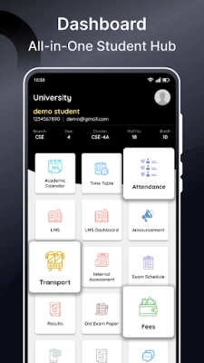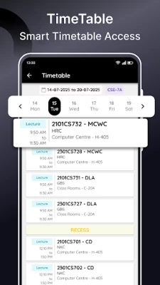 இந்த செயலியின் மூலம், மாணவர்கள் தங்களது முழுமையான விவரங்களை ஒரே இடத்தில் காண முடியும். மாணவரின் பெயர், பதிவு எண், தற்போதைய நிலை (செயலில் உள்ளவர்/இல்லாதவர்), பிரிவு, செமஸ்டர், பிரிவு எண் மற்றும் வரிசை எண் போன்ற அத்தியாவசிய தகவல்களை இது தெளிவாகப் பட்டியலிடுகிறது. மேலும், நடப்பு செமஸ்டருக்கான கால அட்டவணையை நாள் வாரியாகப் பார்த்து, தங்கள் வகுப்புகளை ஒருபோதும் தவறவிடாத வகையில் திட்டமிட உதவுகிறது. இது மாணவர்களுக்கு தங்களது அன்றாடப் பணிகளை எளிதாக்கி, நேரத்தை மிச்சப்படுத்துகிறது.