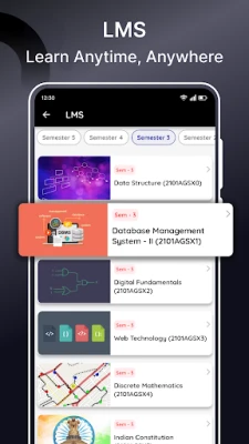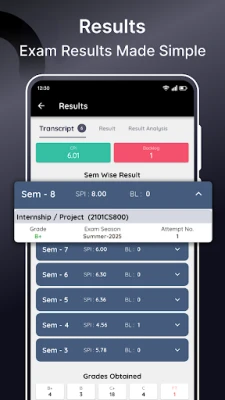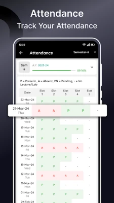 கல்வி செயல்திறனின் முக்கிய அங்கமான வருகைப் பதிவேட்டைக் கண்காணிப்பது, இச்செயலியின் மற்றொரு சிறப்பம்சமாகும். ஒவ்வொரு மாணவரும் தங்களது செமஸ்டர் வாரியான வருகை சுருக்கத்தை எளிதாகக் காணலாம். பாடவாரியாக மொத்த வகுப்புகள் நடத்தப்பட்ட எண்ணிக்கை, மற்றும் ஒவ்வொரு பாடத்திலும் தங்கள் வருகைப் பதிவு சதவீதம் எவ்வளவு என்பதைத் துல்லியமாக இது காட்டுகிறது. இதன் மூலம், மாணவர்கள் தங்களது வருகைச் சதவீதத்தைக் கண்காணித்து, எந்தப் பாடத்தில் கவனம் செலுத்த வேண்டும் என்பதை அறிந்து, தேவையான நடவடிக்கைகளை எடுக்க முடியும். இது அவர்களுக்கு பொறுப்புணர்வை வளர்க்கிறது.
