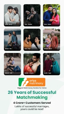 "Oriya Matrimony" என்பது ஓடியாஸ் சமூகத்தினருக்கான நம்பர் 1 மற்றும் அதிகாரப்பூர்வ திருமண செயலி. லட்சக்கணக்கான ஓடியா மணப்பெண்கள் மற்றும் மணமகன்கள் தங்கள் வாழ்க்கைத் துணையைத் தேட இச்செயலியை நம்பியுள்ளனர். பாதுகாப்பான மற்றும் நம்பகமான தளத்தில், உங்களுக்கான சரியான வரனைக் கண்டறியுங்கள்.